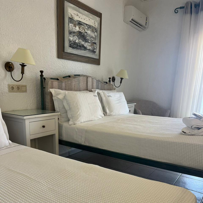 Perfect for two friends or a couple, our Twin Share Room offers a tranquil escape designed for relaxation, connection, and rejuvenation. Each room opens onto lush vistas of Aegiali Bay, inviting in the gentle rhythm of the waves and the peaceful energy of the island.